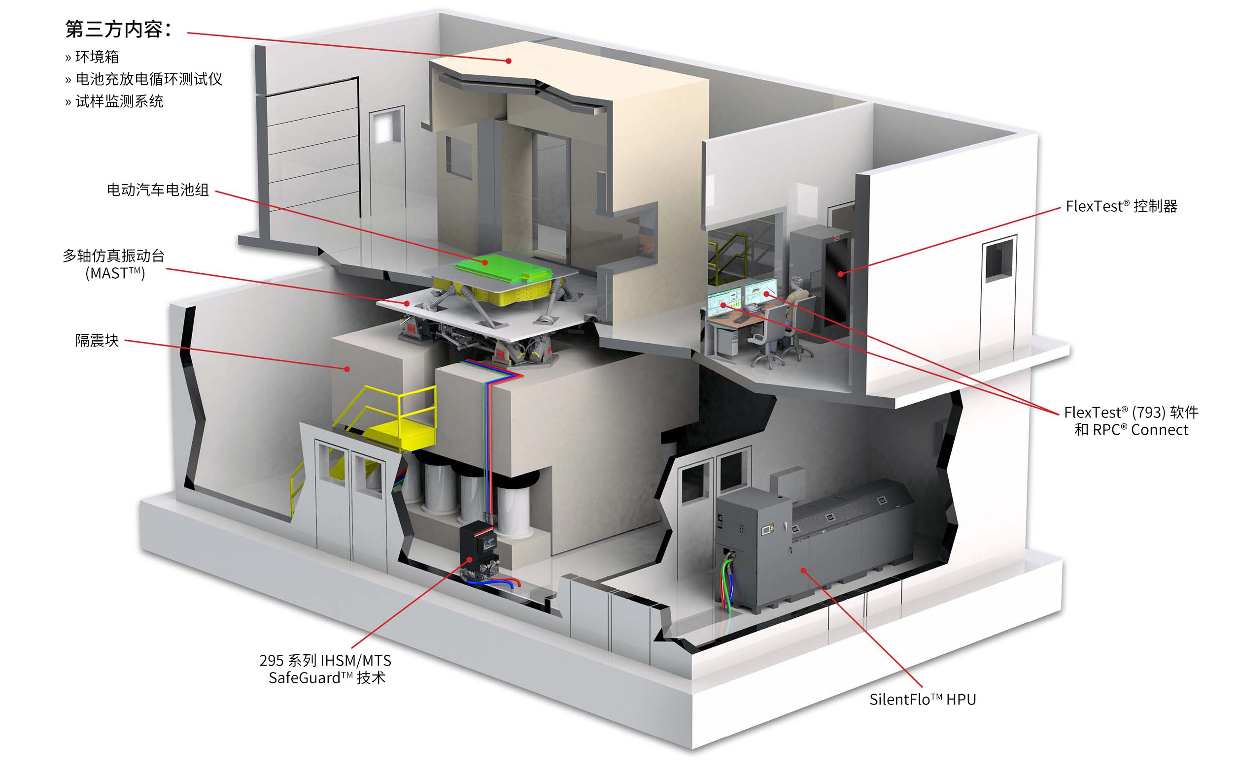 - 多轴仿真振动台 (MAST) 系统有标准配置和定制配置可供选择,能够实现符合国际电池测试标准所需的高频率、高有效载荷以及几何结构。6DOF MAST 系统能够与第三方环境箱、电池充放电循环测试仪和试样监测系统无缝集成。