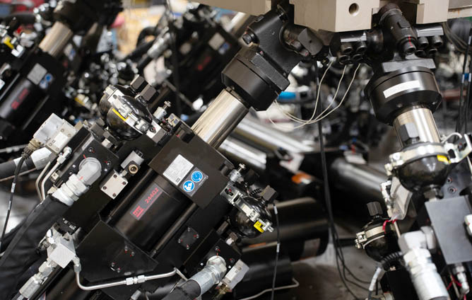 354 LG 型(大尺寸)多轴仿真振动台经过专门设计,支持对电动商用卡车以及越野农用、工程、采矿和林用车辆中使用的锂离子电池组进行全方位的振动测试。作为 MTS MAST 产品组合中的最新成员,此产品采用了安装在 MTS DuraGlide 作动缸十二足支架上的高刚度 2.5 × 3.5 m 振动台,从而使沉重的大尺寸电池组、多电池组和白车身试验台以六自由度 (6DOF) 在高达 200 Hz 的频率下经历实际工况的振动现象。