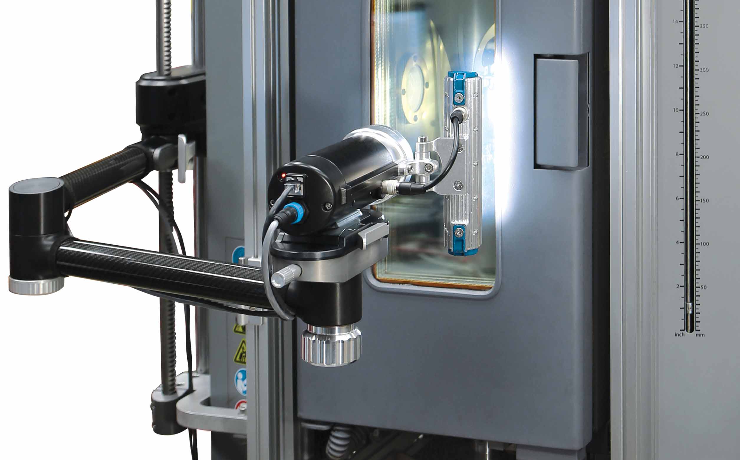 非接触式引伸计的工作距离必须足够长,以便能够在关闭环境箱门后将引伸计放置在环境箱外的适当距离处。